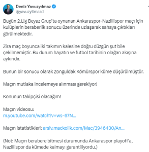 “Bugün 2.Lig Beyaz Grup’ta oynanan Ankaraspor-Nazillispor maçı için kulüplerin beraberlik sonucu üzerinde uzlaşarak sahaya çıktıkları görülmektedir. Zira maç boyunca iki takımın kalesine doğru düzgün şut bile çekilmemiştir. Bu durum hayatın ve futbol tarihinin olağan akışına aykırıdır. Bunun bir sonucu olarak Zonguldak Kömürspor küme düşürülmüştür. Maçın mutlaka incelemeye alınması gerekiyor! Konunun takipçisi olacağım!”