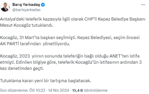 “Antalya’daki teleferik kazasıyla ilgili olarak CHP’li Kepez Belediye Başkanı Mesut Kocagöz tutuklandı. Kocagöz, 31 Mart’ta başkan seçilmişti. Kepez Belediyesi, seçim öncesi AK PARTİ tarafından yönetiliyordu. Kocagöz, 2023 yılının sonunda teleferiğin bağlı olduğu ANET’ten istifa etmişti. Edinilen bilgiye göre, teleferik Kocagöz’ün istifasının ardından 3 kez denetimden geçti. Tutuklama kararı yeni bir tartışma başlatacak.”