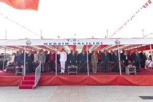 Cumhuriyet Meydanı’nda düzenlenen programa; Mersin Valisi Ali Hamza Pehlivan, Akdeniz Bölge ve Garnizon Komutanı Tuğamiral Murat Fırat ve eşi Nuran Fırat, Mersin Büyükşehir Belediye Başkanı Vahap Seçer ve eşi Meral Seçer, milletvekilleri ile kent protokolü katılım sağladı.