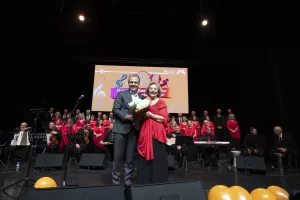 Seçer de Koro Şefi Zeynep Özer Gündüz’e plaket takdim etti.