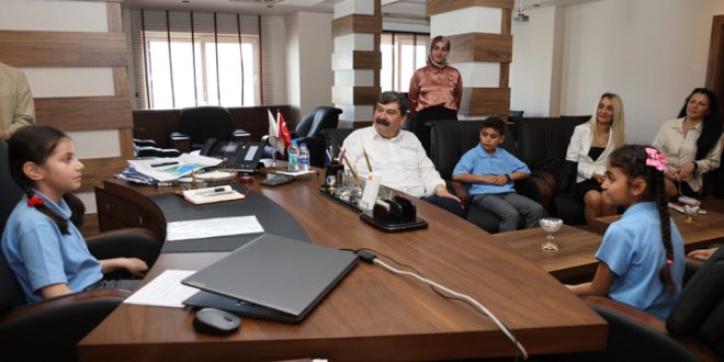Minik Eylül’ün başkanlık koltuğunu bir günlüğüne devraldığı ziyarette; Yusuf Bayık İlkokulu öğrencileri Miran Mert, Berfin Özer ve Muhammed Emin Yılgın da hazır bulundu. Okul Müdürü Ferda Yıldız Yakut ve öğretmenleri de öğrencilerine eşlik etti.