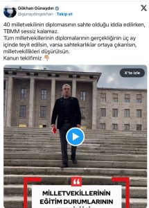X hesabından bir video mesaj yayımlayan Günaydın, “40 milletvekilinin diplomasının sahte olduğu iddia edilirken, TBMM sessiz kalamaz” ifadelerini kullandı.