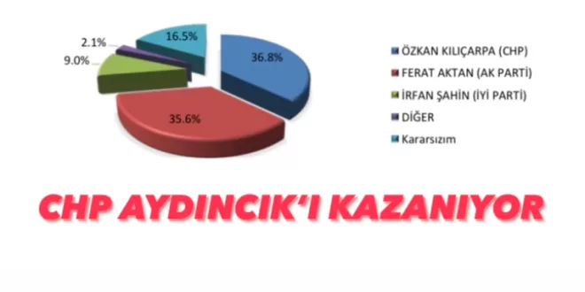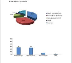 Aydıncık’ta yapılan bir kamuoyu araştırması sonucuna göre, CHP’li Özcan Kılıçarpa yüzde 44.1 oranıyla ilk sırada çıkarken mevcut belediye başkanı AKP’li Ferhat Aktan yüzde 42 oranında kalıyor ve bu ilçede CHP kazanıyor.