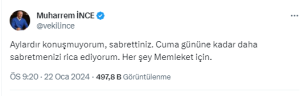 Bu akşam sosyal medya hesabından paylaşım yapan ve mesajında aylardır konuşmadığını belirten Memleket Partisi Genel Başkanı Muharrem İnce, “Aylardır konuşmuyorum, sabrettiniz. Cuma gününe kadar daha sabretmenizi rica ediyorum. Her şey Memleket için.” demişti.