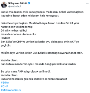 CHP Milletvekili Süleyman Bülbül, CHP’den istifa edip AK Parti’ye geçen Söke Belediye Başkanı Mustafa İberya Arıkan’ın ’24 yıllık hasrete son verdim’ dediği bir videoyu paylaşıp sert tepki gösterdi.