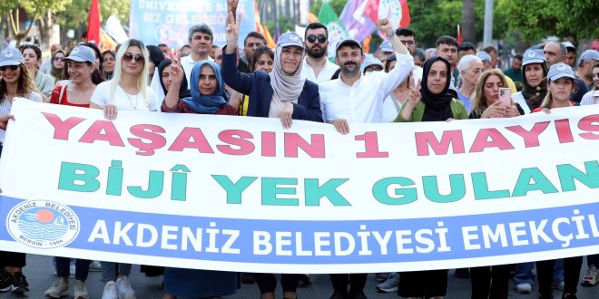 Üzerinde “Yaşasın 1 Mayıs (Bijî Yek Gulan)” yazılı pankart eşliğinde, Akdeniz Belediyesi’nin işçi ve emekçileri ile birlikte yürüyüşe katılan Eş Başkanlar, platforma çıkarak meydanı dolduran yurttaşları selamladı, halaylarla katılıp, alandan yükselen marş ve türkülere eşlik etti. Kortej yürüyüşü esnasında açıklama yapan Eş Başkan Sarıyıldız; “1 Mayıs Dünya İşçi ve Emekçilerin Birlik ve Dayanışma Günü’nde, bizler de Akdeniz Belediyesi emekçileri ile birlikte yürüyoruz. Buradan, dünyanın bütün işçilerinin, emekçilerinin 1 Mayıs bayramını kutluyoruz. Ve diyoruz ki emeğin sömürülmediği, işçilerin haklarının korunduğu, güvencesiz çalışmanın ortadan kalktığı, gençlerin istihdam sorunlarının çözüldüğü, kadına yönelik şiddetin son bulduğu, çocukların güvenli bir geleceğe sahip olabilecekleri bir dünyayı el birliğiyle yaratmak üzere, tüm halklarımızın 1 Mayıs işçi bayramı kutlu olsun” ifadelerini kullandı.