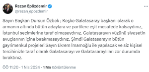 “Sayın Başkan Dursun Özbek ; Keşke Galatasaray başkanı olarak o armanın altında bütün adaylara ve partilere eşit mesafede kalsaydınız, İstanbul seçimlerine taraf olmasaydınız.