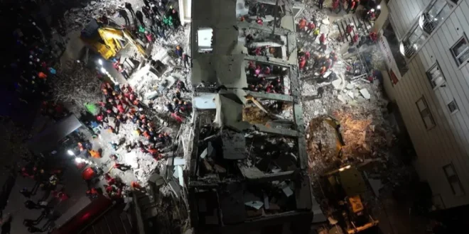 Yüzlerce kişiden oluşan arama kurtarma ekipleri, alandaki molozları kovalarla çıkarırken, beton bloklar vinç desteğiyle askıya alındı.