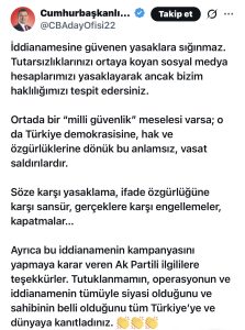 “İddianamesine güvenen yasaklara sığınmaz. Tutarsızlıklarınızı ortaya koyan sosyal medya hesaplarımızı yasaklayarak ancak bizim haklılığımızı tespit edersiniz.