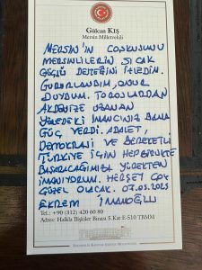 Gülcan Kış, cezaevinde kaleme alınan ve Mersinlilere özel olarak gönderilen İmamoğlu’nun el yazısı notunu da paylaştı. Notta şu ifadeler yer aldı: