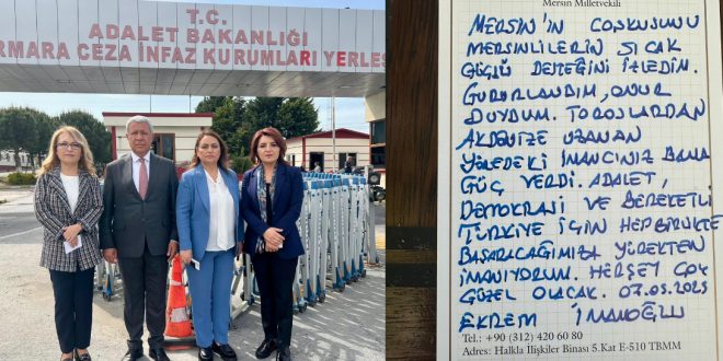 Cumhuriyet Halk Partisi’nin Cumhurbaşkanı adayı ve İstanbul Büyükşehir Belediye Başkanı Ekrem İmamoğlu, tutuklu bulunduğu Silivri Cezaevi’nde, CHP Mersin Milletvekili Gülcan Kış’ın ziyaretinde Mersinli vatandaşlara özel bir mesaj gönderdi.