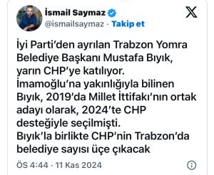 Gazeteci İsmail Saymaz, sosyal medya hesabından yaptığı paylaşımda İyi Parti’den ayrılan Trabzon Yomra Belediye Başkanı Mustafa Bıyık’ın yarın CHP’ye katılacağını yazdı.