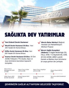 Kıratlı, Anamur ilçesine kazandırılacak olan yeni sağlık merkezi ile ilgili de bilgi vererek, “Anamur ilçemizde Devlet Hastanesi’ne ek olarak 30 ünitelik Ağız ve Diş Sağlığı Merkezi ile içerisinde Psikiyatri, FTR, Diyaliz, Depo ve Arşiv birimlerini içeren sağlık kompleksi de 2026 yatırım programına alındı. Tüm bu yapılacak olan projeler Mersinimize hayırlı olsun” ifadelerini kullandı.