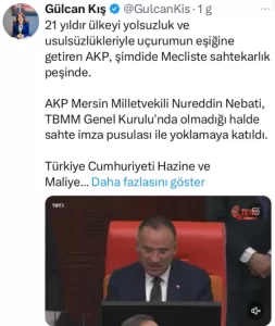 CHP Mersin Milletvekili Gülcan Kış, mecliste sahte imzalı pusulayla yoklamaya katıldığı ortaya çıkan AKP Mersin Milletvekili Nureddin Nebati’ye, “Mersin’de yoksunuz, TBMM’de yoksunuz. Nebati Bey sahte imza pusulanız burada siz neredesiniz?” diye seslendi.