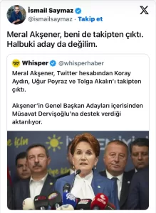 İYİ Parti Genel Başkanı Meral Akşener, Koray Aydın, Mehmet Tolga Akalın ve Uğur Poyraz’ın yanı sıra gazeteci İsmail Saymaz’ı takipten çıkardı. Saymaz, “Halbuki aday da değilim” dedi.