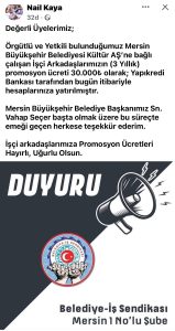 Belediye iş Mersin 1 Nolu Şube Başkanı Nail Kaya sosyal medya hesabından promosyonların hesaplara yatırıldığını duyurdu.