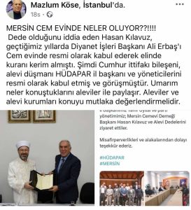Geçmiş yıllarda Diyanet işleri başkanı Ali Erbaşı’ın ziyareti sonrası Alevilerin yoğun tepki gösterdiği Mersin Cemevi yönetimi ve Başkan Hasan Kılavuz  yeni bir sıkandala imza attı.