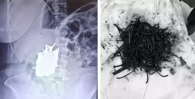 Hasta, genel cerrahi uzmanı Dr. Can Terzier ve ekibi tarafından acilen ameliyata alındı ve midesinden yaklaşık 1 kilo ağırlığında çivi, inşaat demiri, kolye, toka gibi çok sayıda metal cisim çıkarıldı.