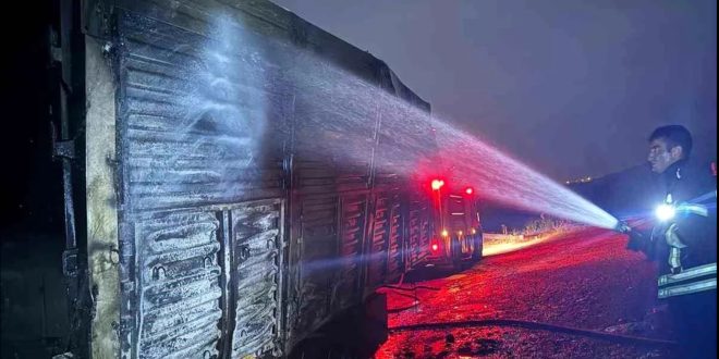 Alınan bilgiye göre, Çamalan bölgesi Alman Mezarlığı civarında B.G.’nin kontrolündeki buğday yüklü 42 ERG 15 kupa plakalı tırın 42 ERK 59 plakalı dorse bölümünün alt kısmından dumanlar yükseldi.