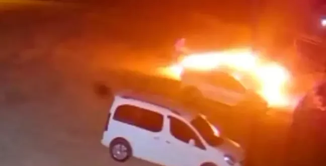 Olay anı ise saniye saniye güvenlik kamerasına yansıdı. Görüntülerde, kafasında kask bulunan motosikletli bir şahsın gelerek, yanıcı maddeyi aracın üzerine döktüğü ve ateşe verdiği anlar yer aldı.