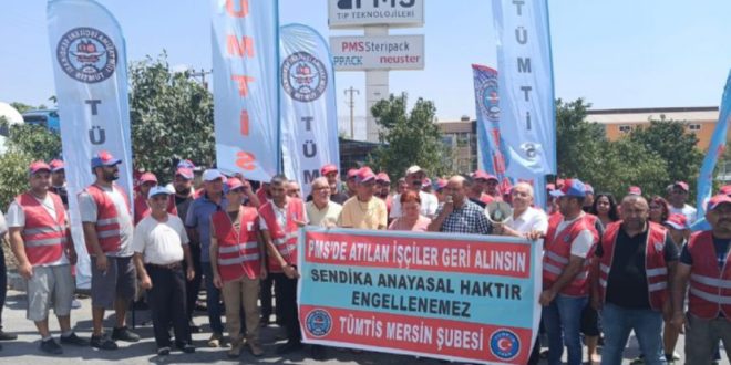 Mersin Organize Sanayi Bölgesinde faaliyet gösteren PMS Tıbbi Cihazlar Teknolojisi Sanayi ve Ticaret A.Ş. fabrikasında çalışan 12 işçi TÜMTİS sendikasına üye olduktan sonra gerekçesiz olarak işten atıldı. İşçi kıyımına tepki gösteren TÜMTİS Mersin Şubesi Mersin Emek ve Demokrasi güçleri ile birlikte fabrika önünde basın açıklaması yaptı.
