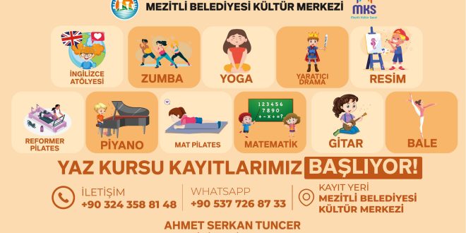 Mezitli Belediyesi, yaz mevsimine özel olarak hazırladığı kapsamlı yaz kurslarıyla bu yıl da kültürden sanata, spordan akademik gelişime kadar geniş bir yelpazede kursları Mezitli halkıyla buluşturuyor. Mezitli Kültür Merkezi başta olmak üzere belediyeye bağlı tüm sanat ve kültür birimlerinde Bale Okulu’ndan Gençlik Merkezi’ne, Kültür Merkezleri’nden çeşitli mahalle atölyelerine kadar düzenlenecek kurslar, özellikle çocuklar ve gençlerin kendilerini keşfetmelerine ve çok yönlü gelişimlerine olanak tanıyor.