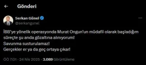 “İBB’ye yönelik operasyonda Murat Ongun’un müdafii olarak başladığım süreçte şu anda gözaltına alınıyorum! Savunma susturulamaz! Gerçekler er ya da geç ortaya çıkar!” açıklamasını yaptı.