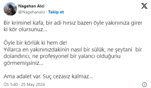 Paylaşımında isim vermeden bir kişiyi hedef alan Alçı, “Bir kriminel kafa, bir adi hırsız bazen öyle yakınınıza girer ki kör olursunuz…” dedi.