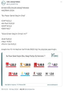 ORC Araştırma Şirketi tarafından yapılan son seçim anketinde hangi partinin ilk sırada yer aldığı ortaya çıktı. Öte yandan katılımcılara “Sizce erken seçim olmalı mı?” sorusu da yöneltildi.