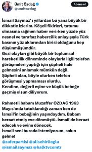 Eski adı Silivri Cezaevi olan Marmara Cezaevinde tutuklu bulunan Zafer Partisi Genel Başkanı Ümit Özdağ, Gezi Parkı eylemleri gerekçe gösterilerek 12 yıl sonra gözaltına alınan gazeteci İsmail Saymaz’a destek paylaşımında bulundu. Özdağ, “İsmail seni burada istemiyorum, sakın gelme!” dedi.