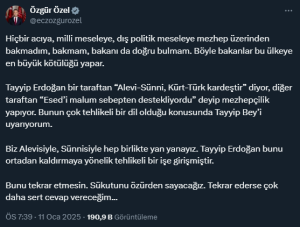 AKP’li Cumhurbaşkanı Erdoğan, CHP’nin eski lideri Kılıçdaroğlu’nu hedef alırken “Esed’i malum sebepten destekliyordu” diyerek mezhepçilik göndermesi yapmasına CHP lideri Özgür Özel’den yanıt geldi.