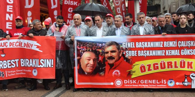 Mersin’de bir araya gelen işçiler Genel-İş Sendikası Başkanı Remzi Çalışkan ve Mersin Şube Başkanı Kemal Göksoy’un serbest bırakılması çağrısında bulundu. Genel-İş Sendikası Genel Sekreteri Çetin Çalışkan, “Buradan bir kez daha çağrıda bulunuyoruz: Hukuk derhal işletilmeli, adalet sağlanmalı; başkanlarımız bir an önce serbest bırakılmalı ve emeğin, demokrasinin savunucuları üzerindeki baskılara son verilmelidir” diye konuştu.