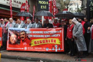 DİSK’e bağlı Genel-İş Sendikası üyesi işçiler 26 Kasım’da tutuklanan Genel-İş Sendikası Başkanı Remzi Çalışkan ve Mersin Şube Başkanı Kemal Göksoy’un tutukluluk halinin devam etmesini protesto etti. Yağmur altında bir araya gelen işçiler adalet ve özgürlük çağrısında bulundu.