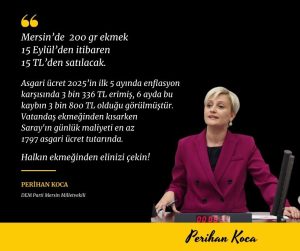 DEM Parti Mersin Milletvekili Perihan Koca, Mersin’de uygulanan ekmek zammına tepki gösterdi. Konu ile ilgili bir açıklama yayınlayan Koca, şu ifadelere yer verdi: