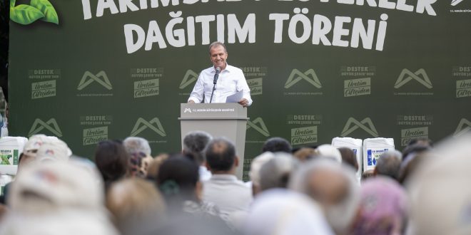 Türkiye Belediyeler Birliği (TBB) Başkan Vekili ve Mersin Büyükşehir Belediye Başkanı Vahap Seçer, ‘Destek Büyükşehir’den Üretim Çiftçiden’ teması ile Tarımsal Hizmetler Dairesi Başkanlığı tarafından Erdemli ilçesinde düzenlenen ‘Atalık Sarı Buğday Tohumu, Enginar Yumrusu, Güneş Paneli ve Sıvı Gübre Dağıtım Töreni’ne katıldı. Mersin Büyükşehir Belediyesi, girdi maliyetlerinin düşürülmesi, tarımda sürdürülebilirliğin sağlanması, yerel ve geleneksel üretim desenlerinin korunması, yenilenebilir enerji kaynaklarının kırsala entegre edilmesi ve doğal afetlerden zarar gören üreticilere destek olunması amacıyla üreticilerin toprağını harmanlamaya devam ediyor. Bu kapsamda Erdemli’de gerçekleştirilen dağıtım töreniyle birlikte, Erdemli ve Silifke ilçesinden 496 üreticiye tarımsal destek sağlandı.