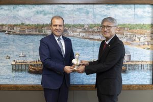 Ertuğrul Fırkateyni Faciası’nın 135. ve 1985’teki Kurtarma Operasyonu’nun da 40. yıl dönümü dolayısıyla Mersin’e gelen Wakayama Eyaleti Valisi Izumi Miyazaki, Kushimoto Belediye Başkanı Tashima Katsumasa ve beraberindeki Japonya Heyeti; Türkiye Belediyeler Birliği (TBB) Başkan Vekili ve Mersin Büyükşehir Belediye Başkanı Vahap Seçer’e nezaket ziyaretinde bulundu. Ziyarette, Türk-Japon dostluğu üzerine sohbet edildi.
