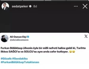 Furkan Bölükbaşı için “Öyle bir milli nefreti haline geldi ki, tarihte ilk kez sağcısı ve solcusu aynı anda zafer kutluyor” ifadelerini kullanan sosyal medya kullanıcısının paylaşımını Sedat Peker de kendi hikayesinde paylaştı.
