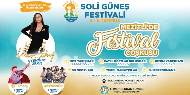 Tüm etkinliklerin ücretsiz olduğu Soli Güneş Festivali, Mezitli’de yazın en hareketli günlerini yaşatacak.Detaylar Mezitli Belediyesi sosyal medya hesaplarından takip edilebilecek.