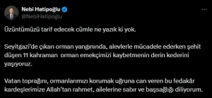 “Üzüntümüzü tarif edecek cümle ne yazık ki yok. Seyitgazi’de çıkan orman yangınında, alevlerle mücadele ederken şehit düşen 11 kahraman orman emekçimizi kaybetmenin derin kederini yaşıyoruz. Vatan toprağını, ormanlarımızı korumak uğruna can veren bu fedakâr kardeşlerimize Allah’tan rahmet, ailelerine sabır ve başsağlığı diliyorum.”