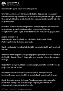 Konu hakkında sosyal medya hesabından bir açıklamada bulunan CHP İzmir Milletvekili Murat Bakan, İstanbul’da yaşananlara benzer bir durum ile karşı karşıya olunduğunu ifade etti. Gözaltına alınanların kaçma şüphesi olmadığını, şafak vakti yapılan gözaltıların açık bir siyasi tercih olduğunu kaydeden Bakan’ın açıklaması şu şekilde: