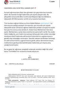 Tüm bunlara rağmen birkaç ay önce Adalet Bakanı Yılmaz Tunç kamuoyuna yaptığı paylaşım sonrasında, aynı konuda çok sayıda takipsizlik kararı olmasına rağmen hakkımda yeniden soruşturma açıldı. Soruşturma sonucunda da Bolu 6. Asliye Ceza Mahkemesi’nde dava açıldı. Mahkemece, açılan dava üzerine duruşma tarihi verildi. Bu arada hakim değişmiş, yeni hakim duruşmaya birkaç gün kala aniden savcılığa tutuklama dahil hakkımda adli kontrol hükümlerinin uygulanmasının gerekli olup olmadığını sormuştur. Savcılık makamı tarafından herhangi bir adli kontrol hükmü uygulanmasına gerek yoktur denmesine karşın, mahkemece gerekçe bile belirtilmeden hakkımda yurt dışına çıkış yasağı konulmuştur.
