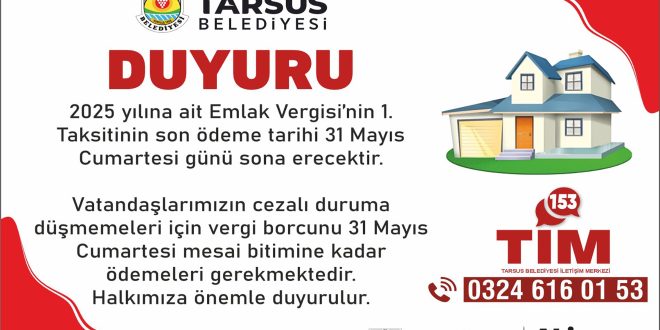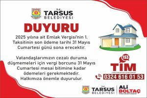 Tarsus Belediyesi, 2025 yılı “Emlak Vergisi” birinci taksit ödemelerinin son günü 31 Mayıs Cumartesi günü sona eriyor.