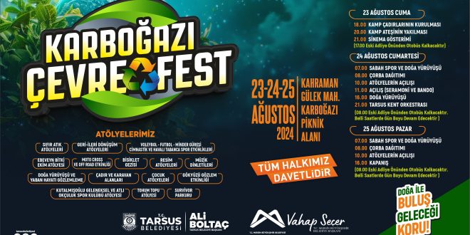 Tarsus Belediyesi tarafından “Doğa İle Buluş, Geleceği Koru” mottosuyla, 23-24-25 Ağustos tarihlerinde düzenlenecek olan Karboğazı Çevre Festivali başlıyor. Birbirinden renkli etkinliklerin yer alacağı festival 3 gün boyunca katılımcılara unutulmaz bir deneyim sunacak.