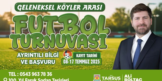 Tarsus’ta 30 Ağustos Zafer Bayramı etkinlikleri kapsamında 16’ncısı düzenlenecek olan Geleneksel Köyler Arası Futbol Turnuvası başlıyor. Turnuvaya katılmak isteyen takımlar, 08-17 Temmuz tarihleri arasında kayıt yaptırabilecek. Başvuru ve detaylı bilgiye 0543 963 78 36numaralı telefondan veya 100. Yıl Faruk Sodan Tesisleri’nden ulaşılabilecek.