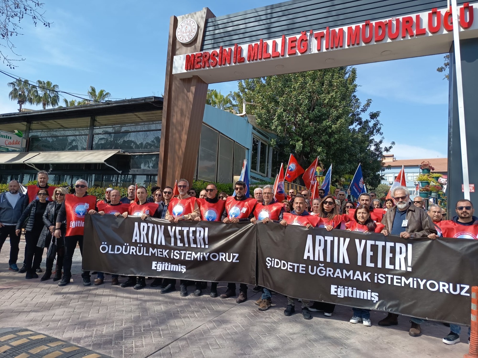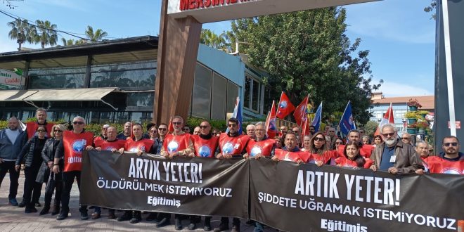 Eğitim-İş, İstanbul’da 2 öğretmenin okuldaki görevi başında saldırıya uğraması ve bir öğretmenin hayatını kaybetmesini protesto etti. Eğitim-İş Mersin Şube Başkanı Yakup Tekin, “Alışveriş merkezlerine kesici-delici aletle girilemezken, okullara rahatlıkla girilebiliyor! Bu bir tesadüf değil; bu bir yönetim zaafıdır. Eğitimde Şiddet Yasası derhal çıkarılmalıdır. Tüm eğitim kurumlarında etkin güvenlik önlemleri alınmalıdır” dedi.