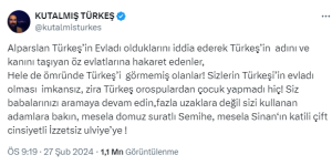 “Alparslan Türkeş’in evladı olduklarını iddia ederek Türkeş’in adını ve kanını taşıyan öz evlatlarına hakaret edenler, Hele de ömründe Türkeş’i görmemiş olanlar! Sizlerin Türkeş’in evladı olması imkansız, zira Türkeş o…… çocuk yapmadı hiç! Siz babalarınızı aramaya devam edin, fazla uzaklara değil sizi kullanan adamlara bakın, mesela domuz suratlı Semihe, mesela Sinan‘ın katili çift cinsiyetli İzzetsiz ulviye’ye!”