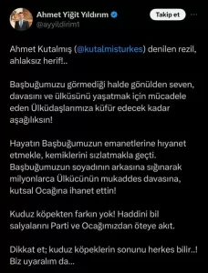 “Ahmet Kutalmış denilen rezil, ahlaksız herif!… Başbuğumuzu görmediği halde gönülden seven, davasını ve ülküsünü yaşatmak için mücadele eden Ülküdaşlarımıza küfür edecek kadar aşağılıksın! Hayatın Başbuğumuzun emanetlerine hıyanet etmekle, kemiklerini sızlatmakla geçti. Başbuğumuzun soyadının arkasına sığınarak milyonlarca Ülkücünün mukaddes davasına, kutsal Ocağına ihanet ettin! Kuduz köpekten farkın yok! Haddini bil salyalarını Parti ve Ocağımızdan öteye akıt.”