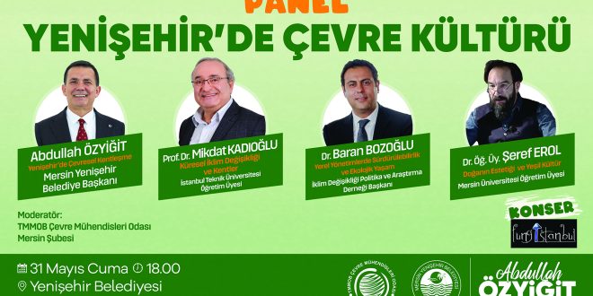 Mersin Yenişehir Belediyesi ve TMMOB Çevre Mühendisleri Odası Mersin Şubesi iş birliğiyle “Yenişehir’de Çevre Kültürü Paneli” düzenlenecek. Yenişehir Belediye Başkanı Abdullah Özyiğit, panelde Yenişehir Belediyesi olarak ekoloji alanında hayata geçirdikleri çalışmaları ve önümüzdeki süreçte atılacak adımları anlatacak. Panel günü atıkları müziğe dönüştüren Fungİstanbul da konser verecek.