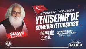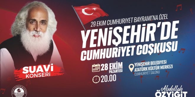 Mersin Yenişehir Belediyesi, 29 Ekim Cumhuriyet Bayramı kutlamaları kapsamında usta sanatçı Suavi’yi Mersinlilerle buluşturacak. 28 Ekim Pazartesi günü düzenlenecek konserde Suavi, türkülerini Cumhuriyet’in 101’inci yılı için seslendirecek. Yenişehir Belediye Başkanı Abdullah Özyiğit, tüm vatandaşları konsere davet etti.