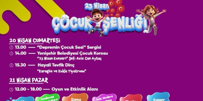 Yenişehir Belediyesinin 23 Nisan Ulusal Egemenlik ve Çocuk Bayramı kutlamaları kapsamında hazırladığı etkinlik programı Yenişehir Belediyesi Atatürk Kültür Merkezinde 20 Nisan saat 13.00’de “Depremin Çocuk Sesi” sergisiyle başlayacak ve ardından saat 14.00’de Yenişehir Belediyesi Çocuk Korosu “23 Nisan Konseri” ile sahne alacak. Saat 15.30’da ise Hayali Tevfik Dinç “Karagöz ve Kukla Tiyatrosu” çocuklarla buluşacak.